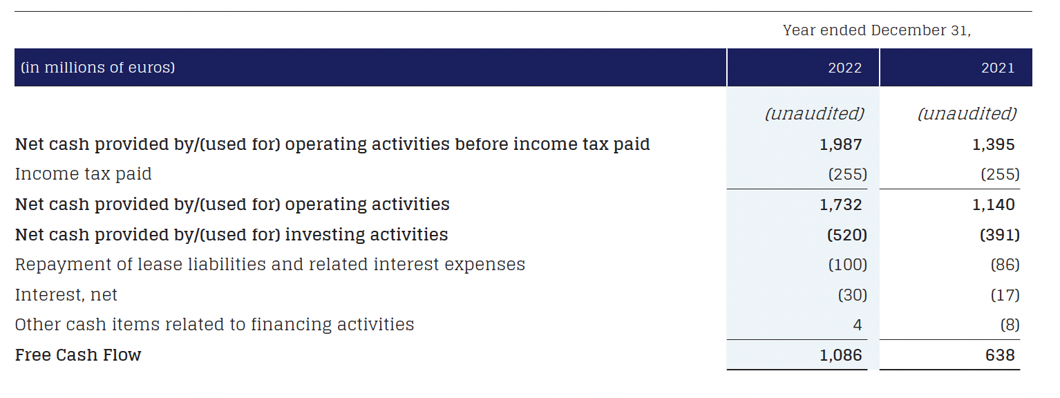 -Net cash provided by operating activities before income tax paid of €1,987 million increased 42.4% compared to €1,395 million in 2021