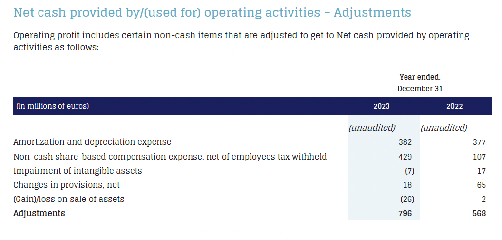 EBITDA of €1,808 million decreased 10.8% year-over-year, or 7.8% in constant currency, and EBITDA margin was 16.3%, compared to 19.6% in the prior year period. EBITDA and EBITDA margin were impacted by non-cash share-based compensation expenses of €561 million during 2023 compared to €107 million during 2022. Excluding these amounts, Adjusted EBITDA was €2,369 million, up 11.0% in 2023, or 14.6% in constant currency, driven by the revenue growth. Adjusted EBITDA margin improved 0.7pp year-over-year to 21.3%.